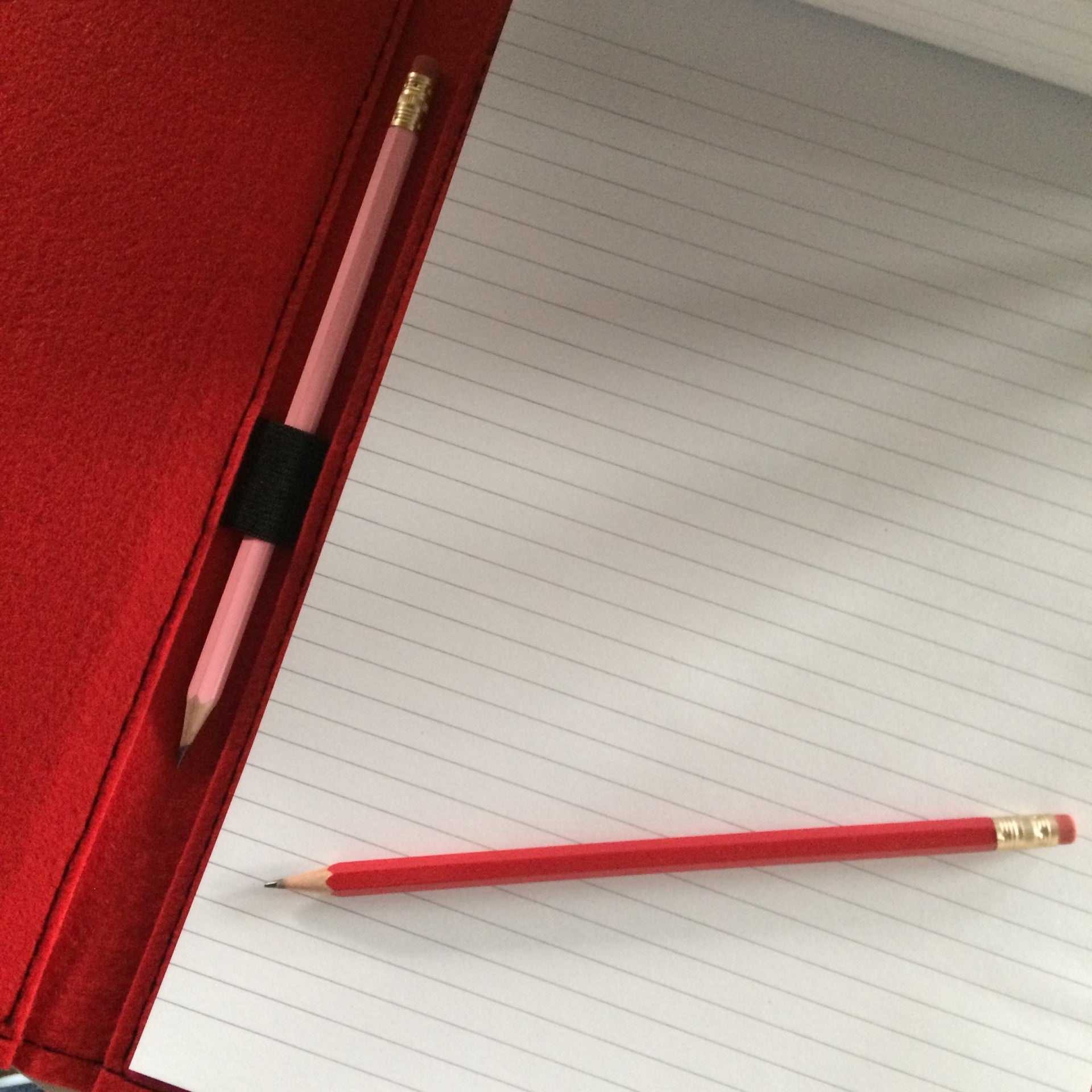 WIE SCHRIJFT DIE BLIJFT Deze A4 Schrijfmap, gemaakt van rood vilt en inclusief schrijfblok. De schrijfmap sluit met een zwart elastiek. Heeft een lus in het midden om een potlood of pen tussen te schuiven.