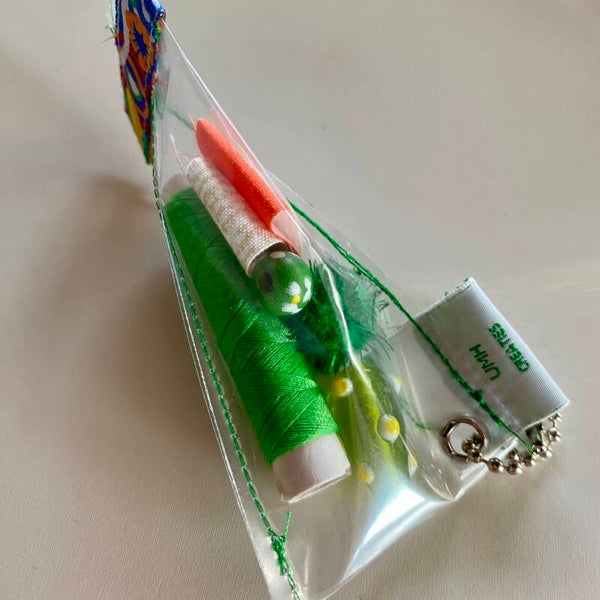 Groen: klosje garen, 2 kralen, mini lapje en vilten glitterballetje.